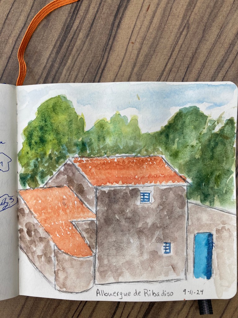 Day 6: Friday, September 5 – Today is a layover day to explore the colors, sights, and sounds of Portomarín while we practice a variety of travel journaling techniques. We continue working on perspective, adding people in front of the iconic Saint Nicolas Church. We have a fun project of painting the things that we carry in our pack. We’ll also cover page lay-outs to combine sketches with written notes and inspirations along the Way. Our lodging, the Pousada de Portomarín, is the oldest hotel in town, beautifully renovated with a pool and spaces to relax. Walking: Around Portomarín. Overnight: Portomarín. Meals included: Breakfast only; Dinner is on your own tonight.